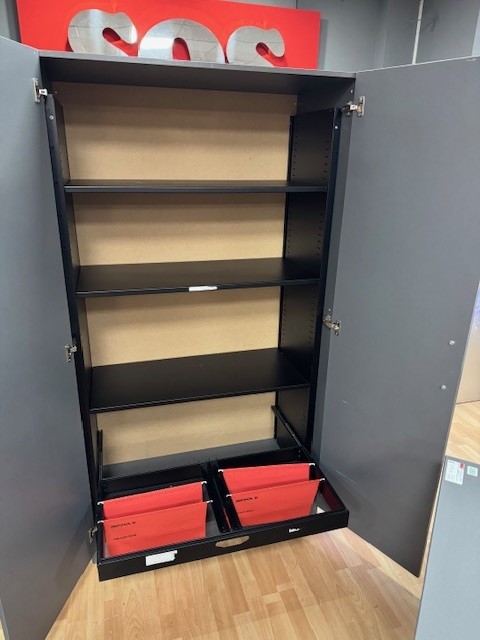 Used Graphite Double door Cupboard with Metal Shelves & Roll Out Suspension File Frame (Item No. G2084)